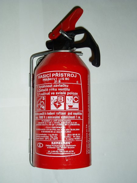 Hasící přístroj 1kg uhasí začínající požár v bytě, kanceláři, automobilu, garáži nebo chatě, bezpečně uhasí požáry elektrospotřebičů pod napětím do 1000V, nezpůsobuje následné škody. Hasící přístroj je pod stálým tlakem.